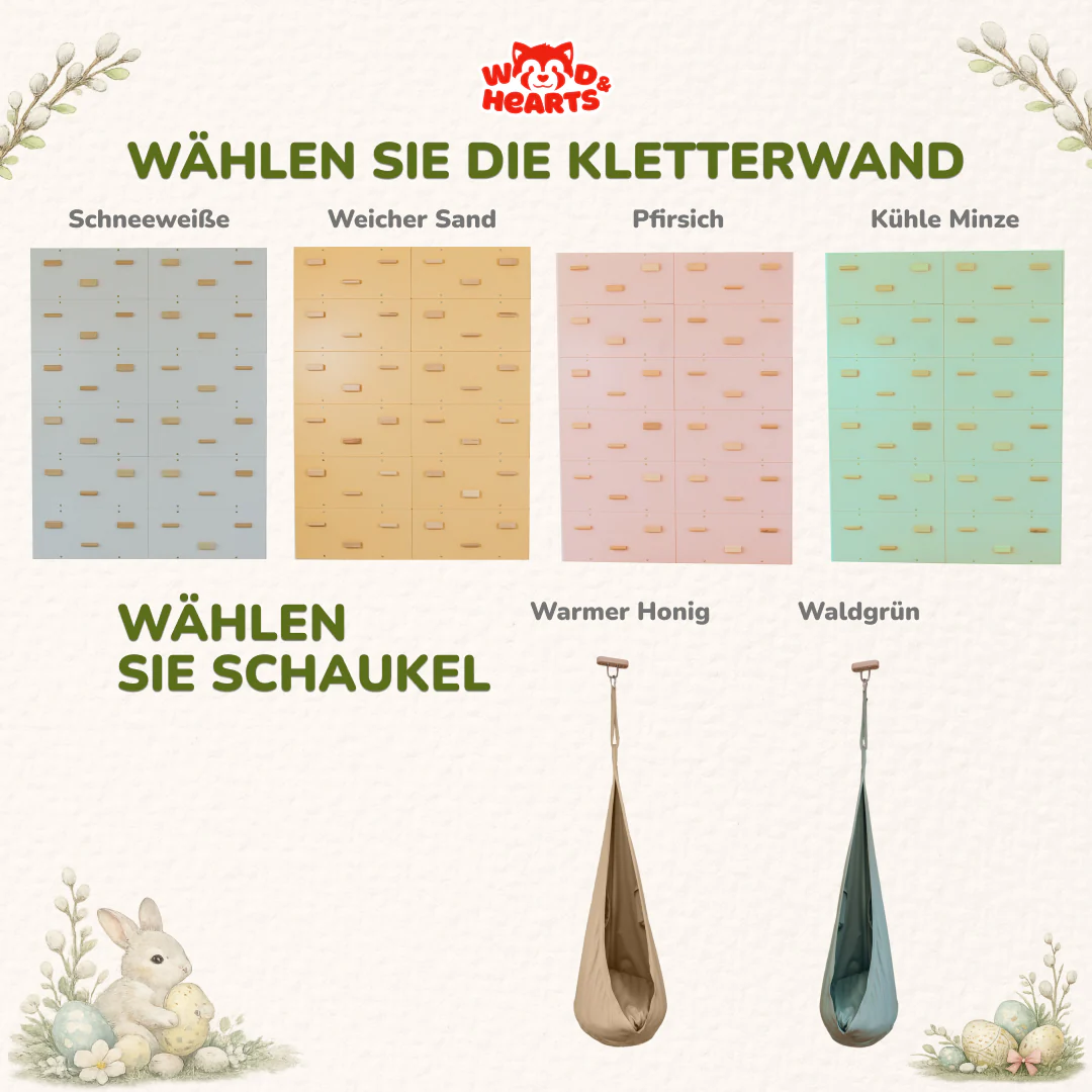 Farbe der Kletterwand wählen: Schneeweiße, Weicher Sand, Pfirsich oder Kühle Minze