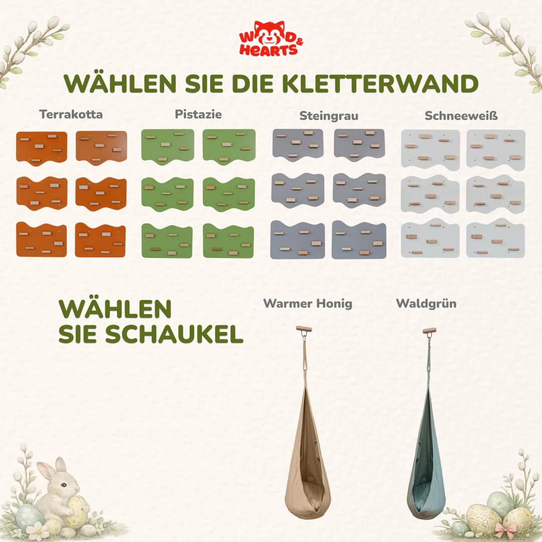 Farbe der Kletterwand wählen: Schneeweiß, Steingrau, Terrakotta oder Pistazie